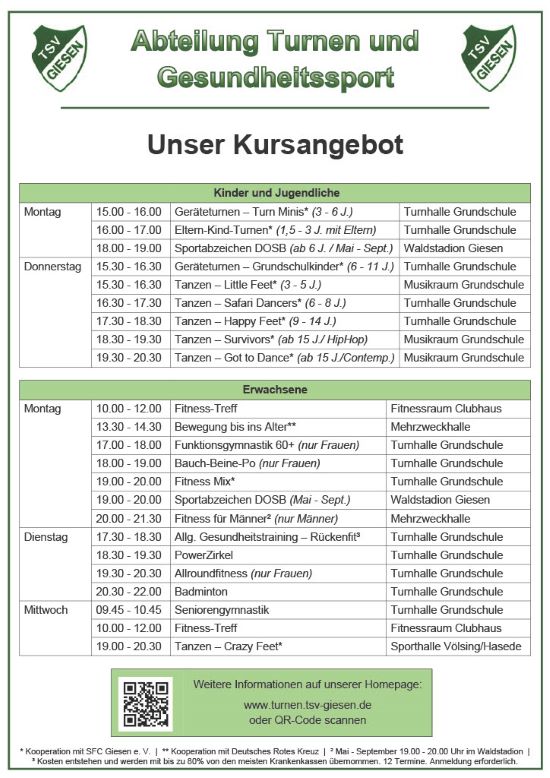 Hier finden Sie in der Übersicht die Trainingszeiten der Turnabteilung des TSV Giesen